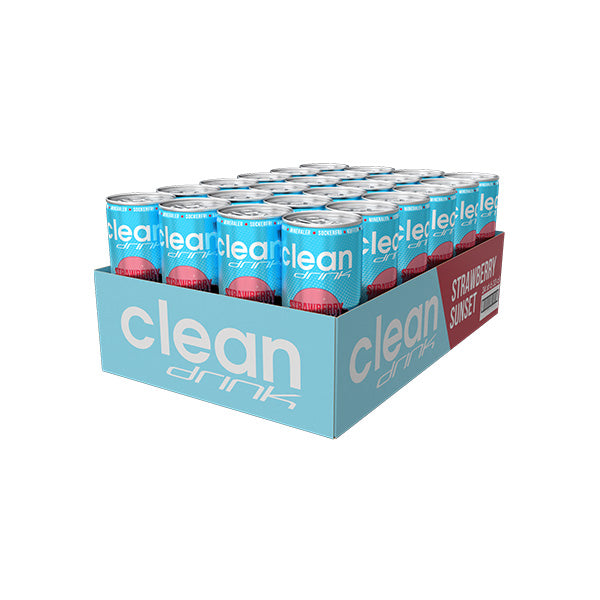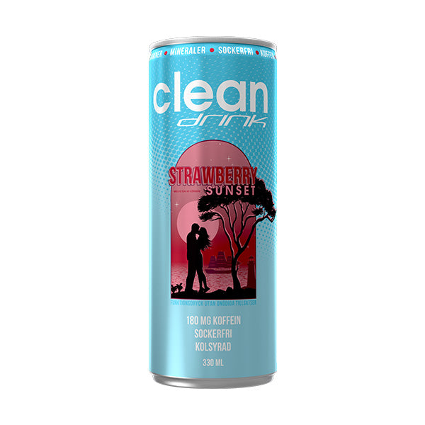 Clean drink Strawberry Sunset är en sockerfri funktionsdryck med fräsch smak av jordgubb och körsbär. Utvecklad i Sverige för en aktiv livsstil och framtagen för dig som vill kombinera smak, funktion och energi i en och samma burk. Drycken innehåller koffein samt vitaminer och mineraler som magnesium, vitamin C, niacin, pantotensyra, vitamin B6, vitamin E, zink, folsyra, biotin, krom, vitamin D och vitamin B12.